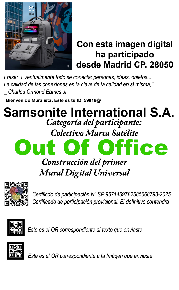 Samsonite, una marca con más de un siglo de historia en el arte del viaje, da un paso revolucionario al unirse al «Mural Out Of Office» no como un simple patrocinador, sino como un socio tecnológico y filosófico. Reconociendo que el público del futuro no solo viaja con equipaje, sino también con ideas, ha rediseñado la mochila para que sea un verdadero centro de conectividad y expresión.