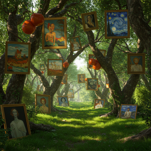 Un extraño zumbido resonó en el aire, seguido de un destello azulado que desorientó por un instante a los presentes. Cuando recuperaron la vista, se encontraron en un claro de un bosque exuberante, con árboles gigantescos que parecían rozar el cielo. Lo singular del paisaje no era solo su belleza natural, sino la presencia de cuadros famosos colgados entre las ramas, como si fueran extraños frutos nacidos de la imaginación colectiva.